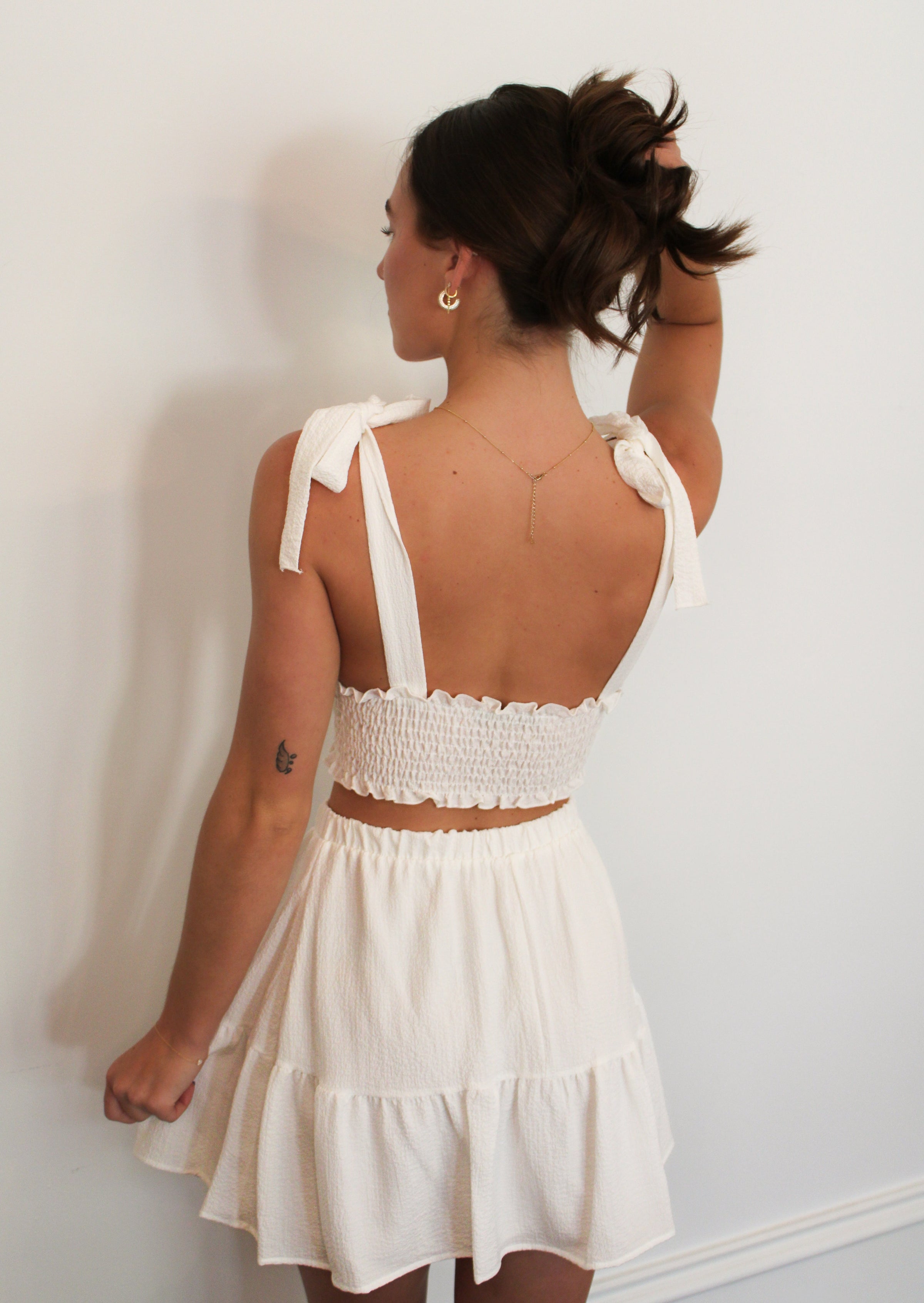 A smocked shoulder tie top is worn with a tiered high-waisted skirt.